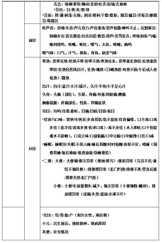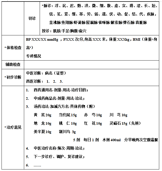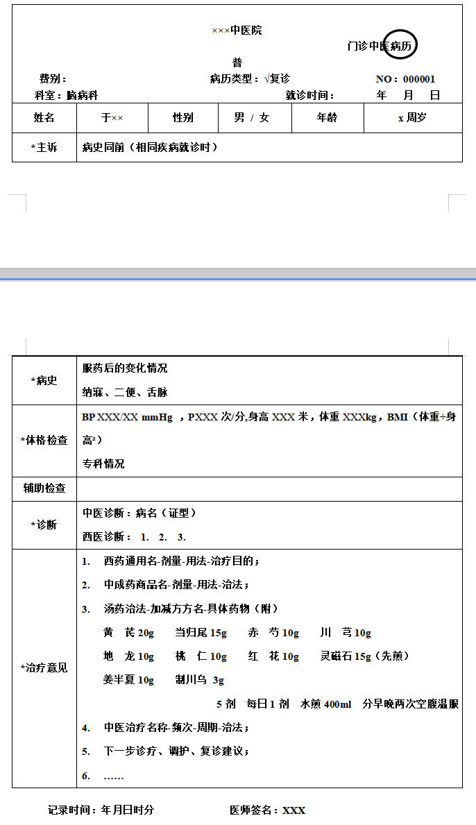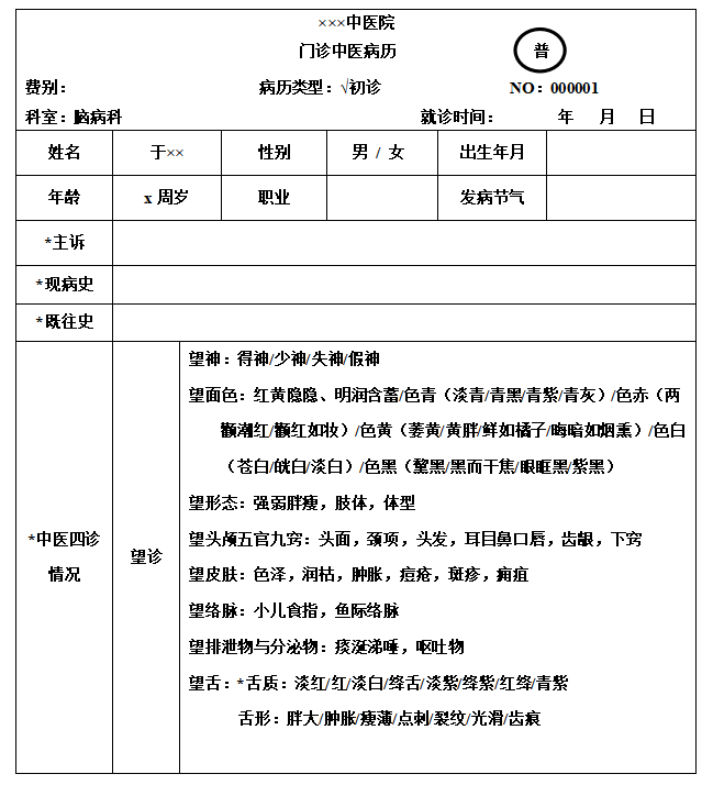 依据《中医病历书写基本规范(第一版)》(卫生部和国家中医药管理局修订工作项目组编),浙江省《病历书写规范(2018版)》,分为初诊、复诊两类,四诊部分参考《中医诊断学》(五版教材),中医病历格式建议如下。