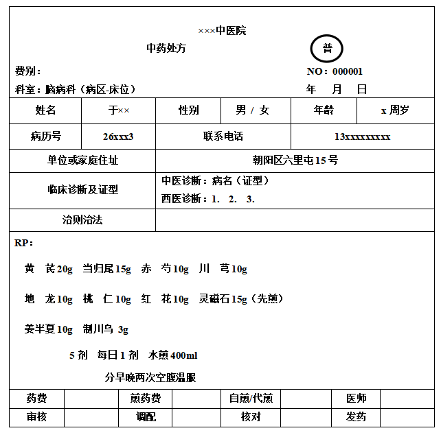 依据《国中医药医政发〔2010〕57号-国家中医药管理局关于印发中药处方格式及书写规范的通知》,中药饮片处方格式建议如下。