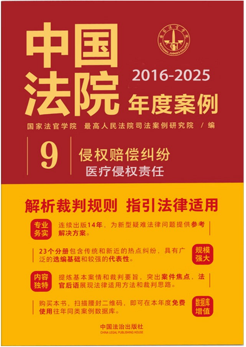 国家法官学院、最高人民法院司法案例研究院编辑的《中国法 院年度案例》刊载从全国法院系统典型案例中择选的各类精品案例,通 过总结提炼典型案例的裁判规则、裁判方法和裁判理念,发挥案例鲜活生 动、针对性强的优势,以案释法,以点带面,在指导司法审判、服务法 学研究、促进法治建设方面发挥重要作用。该类案例不具有任何法律上的拘束力或必须参考的效力,它的核心价值在于其参考性、学习性和研 究性。“医疗损害责任纠纷”案例可以为医务人员提供丰富的实践素材和 思维启发,是重要的知识来源,能警示医务人员在临床工作中的注意义务。 特汇总中国法院十年(2016-2025)年度案例 58 个,其中 2016 年度没有 独立的“医疗损害责任纠纷”篇。